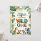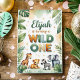 Adorable "Wild One" safari birthday invitation featuring watercolor jungle animals (lion, giraffe, elephant, zebra) with tropical leaves. Perfect for first birthday parties!