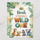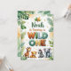 Adorable "Wild One" safari birthday invitation featuring watercolor jungle animals (lion, giraffe, elephant, zebra) with tropical leaves. Perfect for first birthday parties!