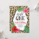 A fun, exotic first birthday invitation with a leopart print background and fun geometric frame. Invitation includes tropical leaves and red and pink hibiscus flowers with the phrase 'Wild One'.