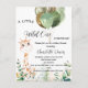 A white background. a cute little baby giraffe and eucalyptus greenery, woodland ferns and balloons. Personalise and add the name and party details. Text: A little Wild One is on the way.