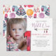 Tribal arrow and tent themed Wild One boy first birthday party invitation featuring a funny mouse beating the drum next to a watercolor tent in purple, navy and fuchsia shades and a big 1 figure. A colourful feather and tents watercolor pattern on reverse. ++++++++++++++ Personalise it with your details and your kid's photo!