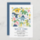 Wild One Dino Party Cute Modern Dinosaurs First Kids Invitations Invites E-Invites features whimsical, cute and colourful dinosaurs with the text "Wild One" in modern blue typography script. Perfect for baby boys or baby girls kids first birthday party celebrations. Send in the mail or simply download the shareable downloadable digital invitation e-invite. Designed by Evco Studio. For coordinating items view www.zazzle.com/store/evcostudio