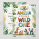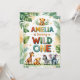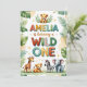 Adorable "Wild One" safari birthday invitation featuring watercolor jungle animals (lion, giraffe, elephant, zebra) with tropical leaves. Perfect for first birthday parties!