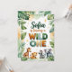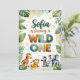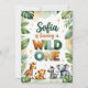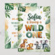 Adorable "Wild One" safari birthday invitation featuring watercolor jungle animals (lion, giraffe, elephant, zebra) with tropical leaves. Perfect for first birthday parties!