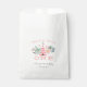 Adorable favour bags for your wild one's first birthday party feature a pink teepee illustration flanked by pastel peach and mint flowers. "She's a wild one" appears in peach lettering. Personalise with the birthday girl's name and party date.