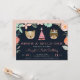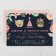 Adorable invitations for your wild one's first birthday feature a boho floral border, a pair of sweet woodland baby animals and a pink teepee illustration. "She's a wild one" appears in peach lettering with your birthday party details beneath, on a rich navy blue background. Cards reverse to solid blush pink.