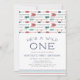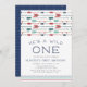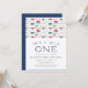 Adorable invitations for your wild one's first birthday feature a border of colourful feathered arrows in navy, teal and red. "He's a wild one" appears in navy blue lettering, with your birthday party details beneath.