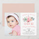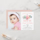 Adorable boho style party invitation's for your little one's first birthday party feature a pink teepee illustration, flanked by pastel flowers and leaves. "She's a wild one" appears in peach lettering. Personalise with your one year old's birthday party details in modern and whimsical peach and grey lettering, and add a favourite photo of the birthday girl on the left side. Cards reverse to solid blush pink.