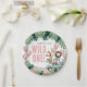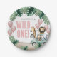 Add a sweet, girly touch to your party table with these Wild One paper party plates designed for a little girl’s celebration. The design features soft pink balloons for a cheerful, playful look, paired with the phrase Name Is A Wild One! The text is shown in a bold rustic pink font mixed with a clean gray sans serif for a modern, charming feel. Space is included to personalize the child’s name.