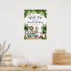 Welcome your guests in style with this Jungle Animals Safari Wild One party sign, the perfect addition to a first birthday celebration. The front features a cheerful "Welcome" message, surrounded by a playful group of safari animals, including a friendly lion, tiger, giraffe, zebra, and a mischievous little monkey. Riding together in a teal blue off-road safari car, these adorable animals set the scene for a fun-filled adventure. Palm trees and lush green leaves add a pop of vibrant colour, enhancing the jungle theme and making this sign a standout decoration.