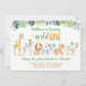 This cute birthday invitation features watercolor safari animals with tropical leaf accents and faux gold foil confetti.