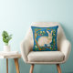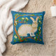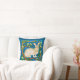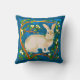 Throw pillow in an illustration of a wild rabbit, surrounded by flowering tree branches, against a dark denim blue background
