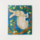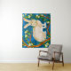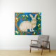 Tapestry in an illustration of a wild rabbit, surrounded by flowering tree branches, against a dark denim blue background