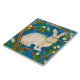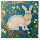 Ceramic tile in an illustration of a wild rabbit, surrounded by flowering tree branches, against a dark denim blue background