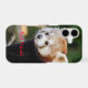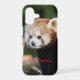 Red Panda iPhone 17 case. This cute phone case features an adorable red panda sitting on a snowy log photo. The words Red Panda are printed in red. Too cute!