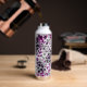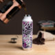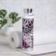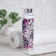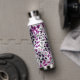 Wild Rhythm water bottle is white with pink and purple leopard spot animal print and charcoal accents.
