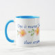 A good quality white ringer mug with a powder blue rim and handle. The design is a handpainted watercolor of a peachy-colored rose and the text reads, 'One is nearer God's heart in a garden than anywhere else on earth. Dishwasher and microwave safe. Also available in larger size.