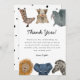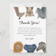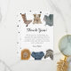 Cute safari theme kid's birthday party thank you card featuring hand drawn illustration of a giraffe, leopard, rhino, lion, elephant, and zebra. The default text thanks the guests for coming to the party and for the gifts. Customise this product by adding your name at the bottom.