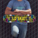 This geometric patterned skateboard has plenty of colour and WILD SKATER text.