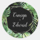 This wild tropical palm black geometric wedding envelope seal is perfect for a beach or destination wedding. The design features an exotic array of green watercolor banana palm tree leaves, ferns, foliage, botanical plants and greenery on a black background for a bold tropical summer feel. Personalise the label with the names of the bride and groom.