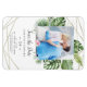 This wild tropical palm geometric photo save the date magnet is perfect for a beach or destination wedding. The design features an exotic array of green watercolor banana palm tree leaves, ferns, foliage, botanical plants and greenery for a tropical summer feel. Personalize with your engagement photo, names, wedding date, and website address.