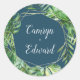 This wild tropical palm navy geometric wedding envelope seal is perfect for a beach or destination wedding. The design features an exotic array of green watercolor banana palm tree leaves, ferns, foliage, botanical plants and greenery on a navy blue background for a tropical summer feel. Personalise the label with the names of the bride and groom.