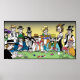 Cartoon Illustration of an intense poker gamme including all the characters you would find in any western inclding the gunslinger, rancher, blacksmith, irish immigrant, the local indian, dancehall girl, barmaid, sheriff, his deputy intertaker, the kid that rides off into the sunset, and the mexican laborer. full colour on canvas