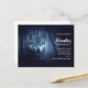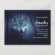 Birthday invitation postcard with an image of a magical mystical wolf standing in a forest with gentle snow falling around.