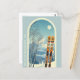 Postcard from a wonderful skiing holiday in the beautiful mountains of Wildcat Mountain, New Hampshire! This postcard features an arch with a stunning blue-grey mountain landscape and retro ski boards in an orange tribal pattern in the foreground. The rest of the card is in a lovely light blue tone with the location lettering in a modern font. The card is a lovely combination of retro and modern, and I hope you enjoy it!