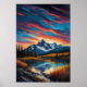 Step into the heart of untamed beauty with a captivating digital art poster. A small crystalline lake reflects the wild surroundings – a rocky shore kissed by gentle ripples, a pine forest standing as nature's sentinel, and distant snowy mountains, their majesty set against the horizon. This poster encapsulates the serenity and grandeur of unspoiled wilderness.