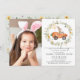 Celebrate your little bunny's birthday with this super adorable invitation featuring a cute rabbit riding a carrot car and lush wildflower wreath.