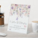 A Lifetime of Butterflies Bridal Shower Tabletop Sign. Welcome guests to your bridal shower with this whimsical and romantic tabletop sign, perfect for an "A Lifetime of Butterflies" themed celebration. The design features a soft arrangement of watercolor wildflowers and greenery along the top, with multiple pink and purple butterflies fluttering throughout. The color palette includes blush pinks, dusty rose, lilac, lavender, violet, and fresh greens for a dreamy, garden-inspired look.
