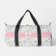 Add a soft, colorful touch to your everyday essentials with this elegant duffle bag featuring a delicate wildflower pattern in pastel shades of pink, purple, blue, yellow, and green on a clean white background. The design is printed on both of the large main sides of the bag, each featuring a pink bar with a white and gray monogram for a graceful, personalized look. The wildflower pattern continues onto each end of the duffle for a cohesive, polished design.