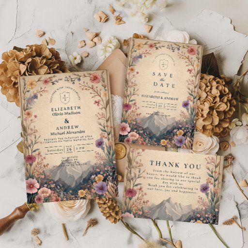A romantic wedding design inspired by alpine landscapes and delicate wildflower botanicals. Soft blush, lavender, and muted green florals frame a serene mountain backdrop, creating a timeless, nature-forward look.