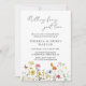 Colourful wildflowers and butterflies create a casual design for your garden elopement reception invitations. Yellow, orange, pink, and blue flowers dance across the bottom. The serif and cursive fonts add to this beautifully classic design.