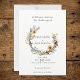 Invite guests to your wedding with this charming rustic card featuring a delicate floral wreath. The wreath is composed of beautiful hand-drawn style wildflowers and soft foliage, evoking a sense of nature and romance. The minimalistic layout leaves plenty of space for your wedding details, while the soft earthy tones of the flowers provide a lovely contrast against the white background. Perfect for a countryside, garden, or outdoor celebration, this design adds an elegant yet whimsical touch to your special day.