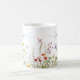 Custom script personal name Coffee Mug. A meadow full of watercolor wildflowers, butterflies and dragonfly. The name on both sides is in a peach script font with attached swirls/glyph on each side of the name for a feminine touch. You can keep them or delete. Try to write your name between the square icons and see before you decide.