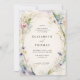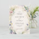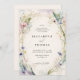 Delicate wildflowers and lush greenery, painted in soft watercolor with tones of purple, lavender, pink and green, intertwine gracefully against an ecru background to create an elegant floral frame for this wedding invitation. The design is a timeless blend of classic sophistication and the playful charm of wildflowers, perfect for the modern romantic. Ideal for a spring or summer, or even fall or winter wedding, this invitation suits both the elegant bohemian bride and those planning a garden fête, backyard celebration, or a formal event in a château's gardens. A beautiful choice for brides who seek a touch of nature's whimsy with refined elegance.