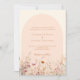 An elegant wedding invitation. A cream, beige coloured background and a peach coloured arch. Decorated with watercolored wildflowers in beige, pink.