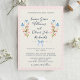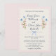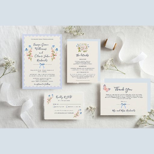 Floral Wedding invitations with beautiful romantic delicate watercolor wildflowers in blue and pink, with soft blue ribbon on a vintage cream scalloped background. Easy to personalize names, and wedding invitation wordings in a lovely script fonts. Pretty country wedding style. Back of wedding invitation is a pastel pink.