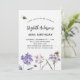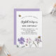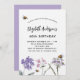 A white background. Decorated with bees and painted wildflowers in violet and pink. Personalise and add a name and party details.