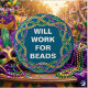 Get the good throws this year with this hilarious "Will Work For Beads" button! The design features a festive intertwined circle of traditional Mardi Gras beads in purple, green, and gold against a deep blue background. The bold white typography makes a funny statement perfect for wearing to New Orleans parades, Fat Tuesday parties, or masquerade events. Whether you are on Bourbon Street or celebrating at home, this pin adds the perfect touch of NOLA humor to your outfit.