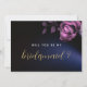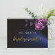 A rose and eucalyptus greenery, hand-drawn in colour pencil and layered digitally with purple, make for a modern, sophisticated, elegant yet chic "Will you be my bridesmaid?" invitation. The black and dark blue background with hints of purple and lights illuminate the midnight sky. The elegant calligraphy, in the hue of gold, makes this stylish black and purple foliage invitation even more elegant.