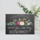 Bridesmaid proposal card with watercolor floral arrangement in burgundy, blush pink, orange and garden greenery on chalkboard background. Personalise text, font style, colour and size.