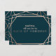 A modern and contemporary "will you be my maid of honour" card, features a "faux foil" gold rose geometric pattern over a dark turquoise background. All your details are spelled in a beautiful modern typo.