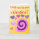 This cute Valentine's Day card design features the question "Will you be my valentine?", along with a happy, smiling snail character and several heart shapes (indicating love). The message on the inside can be personalised.