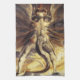 William Blake Red Dragon kitchen towel. Watercolor illustration from 1803-1805. English poet and artist William Blake illustrated the Bible, especially the book of revelations. The Red Dragon and the Woman Clothed with the Sun depicts a red dragon with his back to the viewer standing over a freightened woman with his wings outspread. The woman is clothed with the sun and looks up with her hands clasped in prayer. A beautiful work for fans of William Blake, dragons, bible illustrations, and English art.