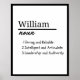 This custom name definition poster is more than just a decorative item; it's a personalised piece that highlights the unique essence of the name William. Make any space special with this beautifully designed poster that celebrates the individuality and history of the name William.