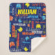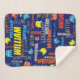 Personalised name pixel gaming multi coloured on blue graphic blanket. This blue, orange, yellow, grey and red text typographical blanket can also be customised with your own name, currently reads William. Other name available or contact me for name requests or for help with fitting your name on to this design. Original art and design by Sarah Trett for www.mylittleeden.com