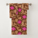 Towel set in a vintage William Morris floral damask pattern of anemone flowers and leaves, digitally enhanced and coloured - light coffee brown leaves, and flowers in shades of deep fuchsia and coral pink on a dark chocolate brown background